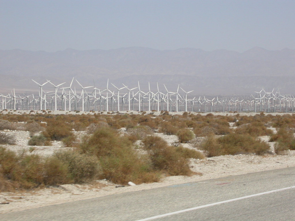 Nach dem Frühstück am Swimmingpool durchquerten wir das Tal von Palm Springs. Es ist hier nicht nur heiss, sondern auch sehr windig. Die Felder von Windpropellern zeugen davon und werden zur Energieerstellung benutzt. Entlang des Joshua Tree National Park errteichten wir Twenty-Nine Palms und kurz danach die Wüstenkneippe 'The Palms' oder 'Wild Elephant'.