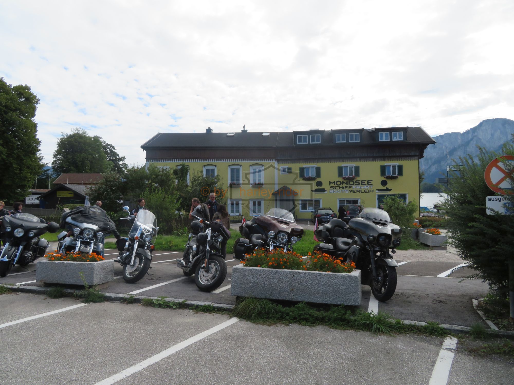 Die erste Tour hätte uns eigentlich zum Attersee, St. Gilgen und über den Pechauer Sattel nach Salzburg führen sollen. Doch der Regen in den 'Voralpen' zwang uns zu einer nördlichen Route auf der Bundesstrasse über Vöklabruck nach Salzburg. Dort fuhren wir zum Harleyhändler wo wir wieder auf den Rest der Gruppe stiessen. Die waren schon früher gefahren, denn Haris Maschine benötigte den ersten Service.
