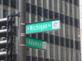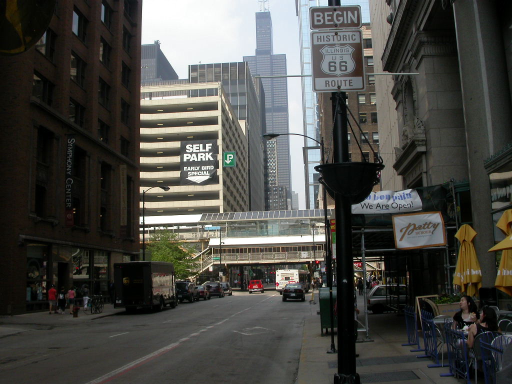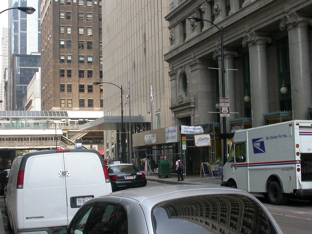 Da es am Freitag zeitlich nicht drinnen liegt mit den Bikes den Startpunkt der Route 66 aufzusuchen, nun halt zu Fuss. Von der Bahnstation 'Jackson' geht es entlang diese Strasse zuerst mal unter dem berühmten 'Loop' durch zur Kreuzung Jackson / Michigan, wo der beginn der Route 66 ist. Doch oweh... da steht ja 'END' of Route 66, wir sind doch aber erst am Anfang. Des Rätsels Lösung : Jackson Blvd. ist mittlerweile eine Einbahnstrasse und somit das Ende für allfällig West - Ost Reisende. Ein Block weiter an der Adams Street findet sich dann das Begin-Schild.