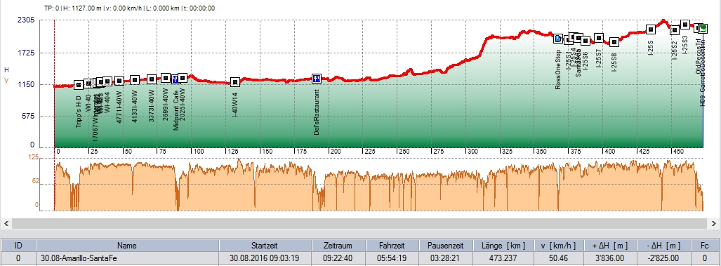 Hier war Mittagessen und danach verliessen wir die Route 66 Richtung Las Vegas, das in New Mexiko, und Santa Fe in noröstlicher Richtung. Ab Tucumcari war mal freies Fahren angesagt und jeder konnte die nächstn knapp 200 Kilometer bis Las Vegas nach seinem Guschto fahren und individuell für Fotos und anderes Anhalten. Noch einmal Tanken und zügig fuhren wir weiter nach Santa Fe in die schöne Stadt im Pueblo Stil.