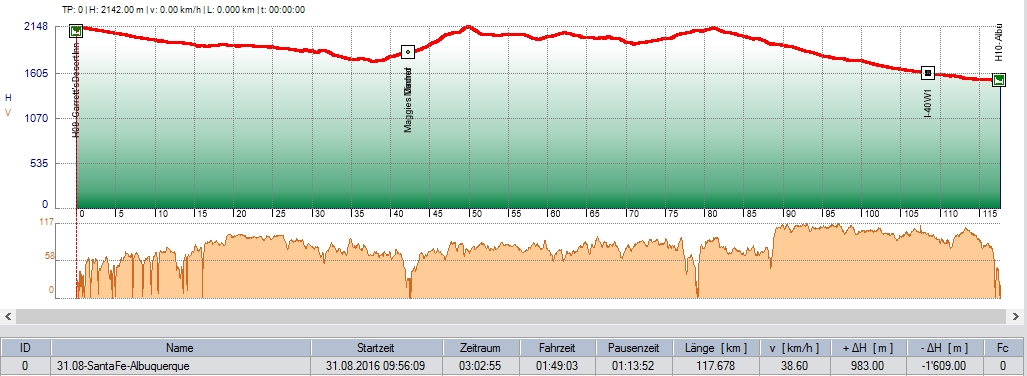 Bei der Abzweigung zum Sandia Crest verabschiedete ich mich von der Gruppe und fuhr direkt nach Albuquerque. Hier hätte ich doch gerne mit einem aus der Gruppe getauscht. Denn die kurvige Strecke zum Aussichtspunkt, wo man weit ins Tal de Rio Grandes sieht, hoch lässt doch manch Bikerherz nach all den vergangenen geraden Strecken höher schlagen.