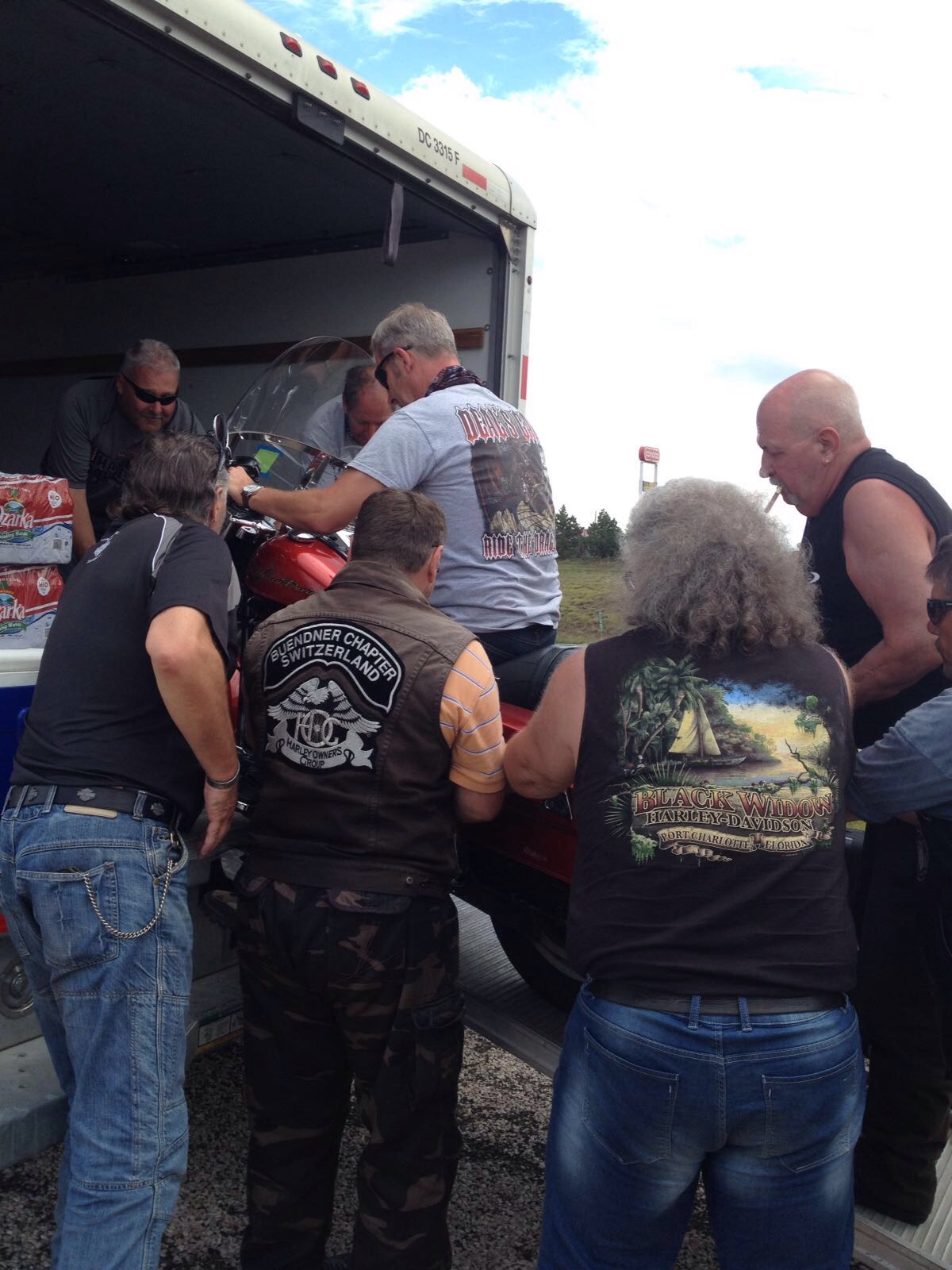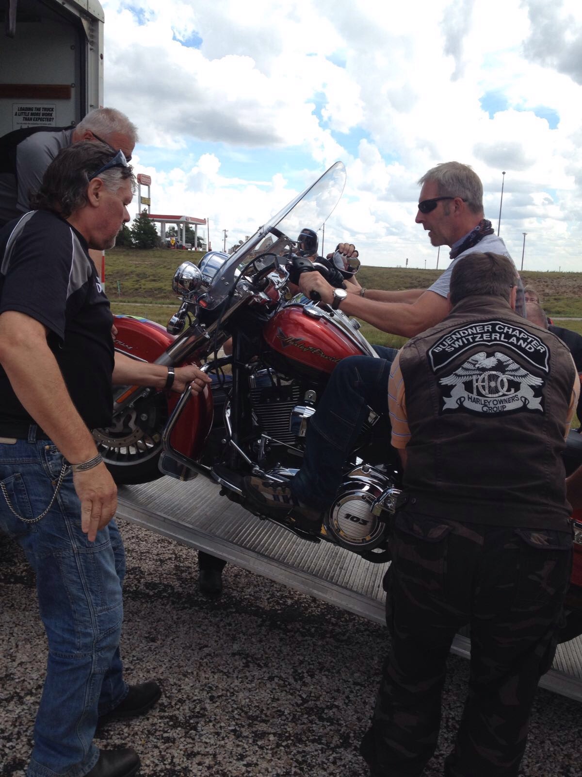 Kurz nach dem Tanken in Alanreed hatten wir unsere einzige Panne auf der ganzen Tour, bei Sandros Sportster riss das Kupplungskabel. Also Gepäck ausladen, Ersatzmaschine raus, Pannenfahrzeug hinein und das Gepäck hinterher. Diese ganze Aktion dauerte kene 10 Minuten da alle einander halfen, dies zeigte einmal mehr was für eine tolle Gruppe da zusammen gekommen ist. Sandro war zuerst etwas skeptisch aber er freundete sich mit der Road-King Meile um Meile mehr an, und zum Schluss war er ganz happy mit dieser doch etwas grösseren Harley.