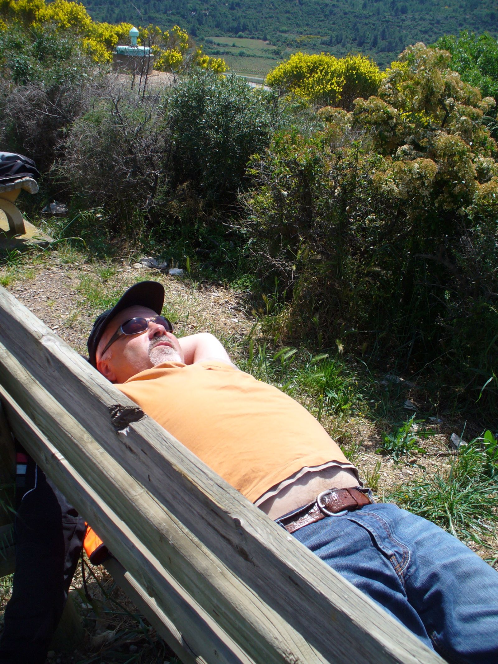 Ab Saint-Affrique hielten wir uns recht südlich und auf kleinen verkehrsarmen Strassen über diverse Hügel gelangten wir an den Lac de la Raviège. Hier machten wir einen etwas verspäteten Kaffeehalt. Auf der Weiterfahrt hielt ich bei einer Bäckerei an um ein Picknick einzukaufen, welches wir dann auf einem schön gelegenen Plätzchen oberhalb von La Caunette zu uns nahmen. Nach dem Picknicken genossen wir die Stille und die Landschaft und Ruedi nahm eine 1/4-tel stündige Auszeit für seinen 'Power-Slip'.