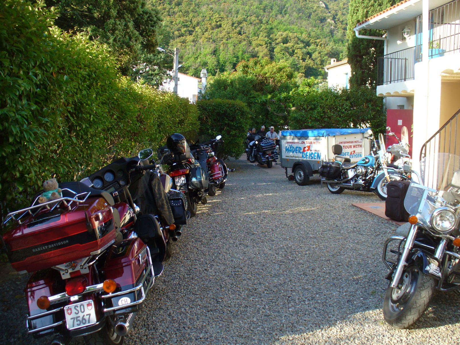 Nachdem wir Narbonne umfahren hatten kamen wir auf die grüne 'bis'-Strasse zwischen Narbonne und Perpignan. Hier fühlte man sich zwischendurch wie im wilden Westen, die Strasse zieht kurvenreich entlang von kleinen Bächen, über Hügel und durch Täler gegen die Pyrenäen und unserem Tagesziel, Treffpunkt und Tourbeginn Céret. Das etwas abseits und erhöht gelegene Hotel 'La Terrasse au soleil' fanden wir dank dem Navi auf Anhieb.