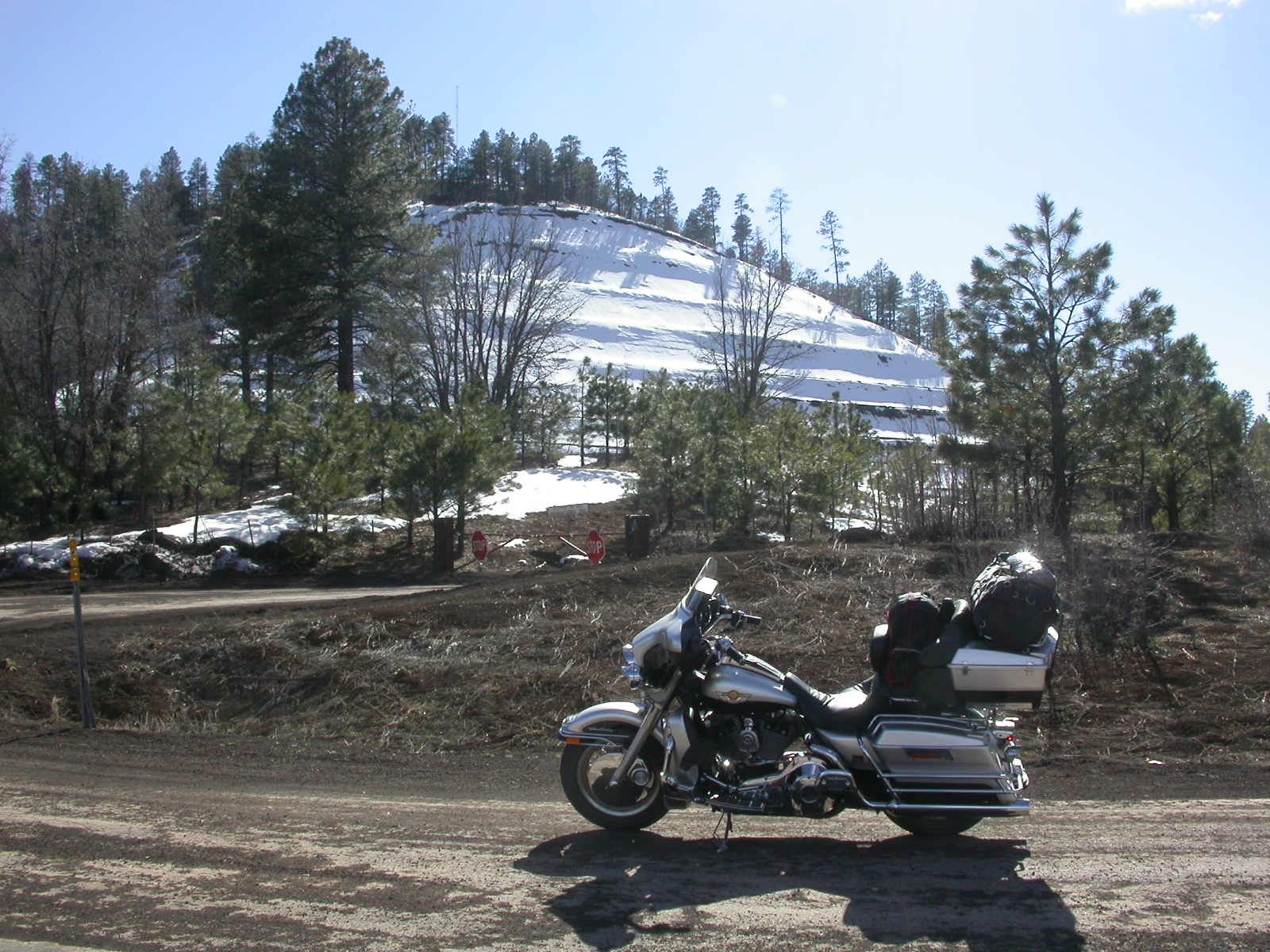 Über Globe erreichte ich anschliessend das Apache Indianer Reservat, welches ich durchqueren musste, um nach Eager, dem Ausgangspunkt des Coronado Trails zu gelangen. Dieser Abschnitt des Trails zwischen Eager und Morenci (HW 191) ist ca 200 Kilometer lang und führt in Nord- / Südrichtung durch den Apache Sitgreaves National Forest auf einer einsamen kurvenreichen Strasse. Hier verliess mich mein Wetterglück, welches ich vermutlich in den letzten vier Wochen zu stark strapaziert hatte, denn es schlug um und ich kam sogar noch mit Schnee in Berührung.