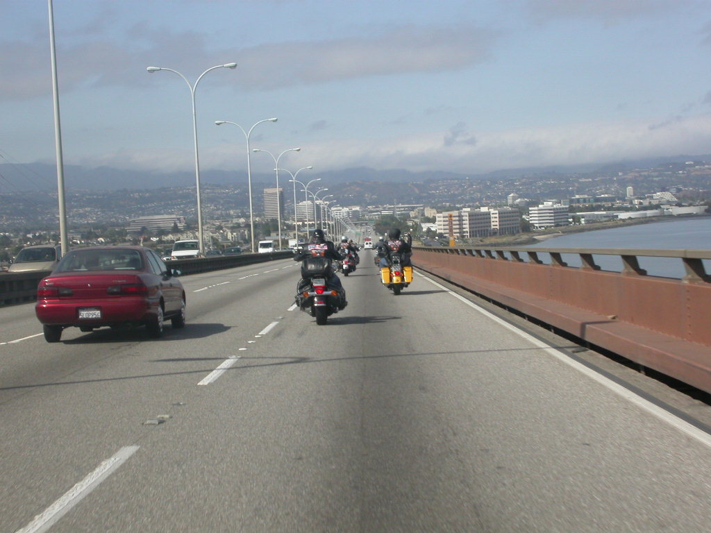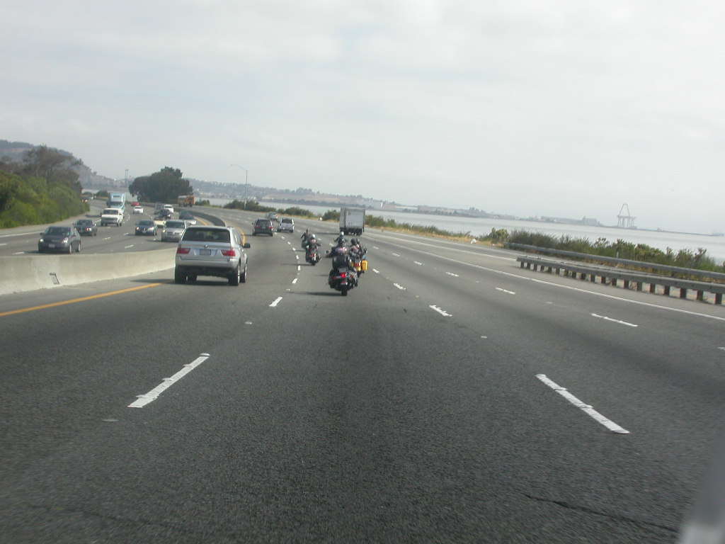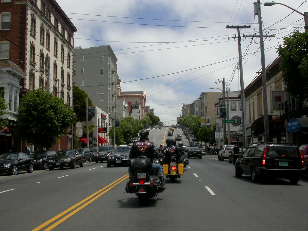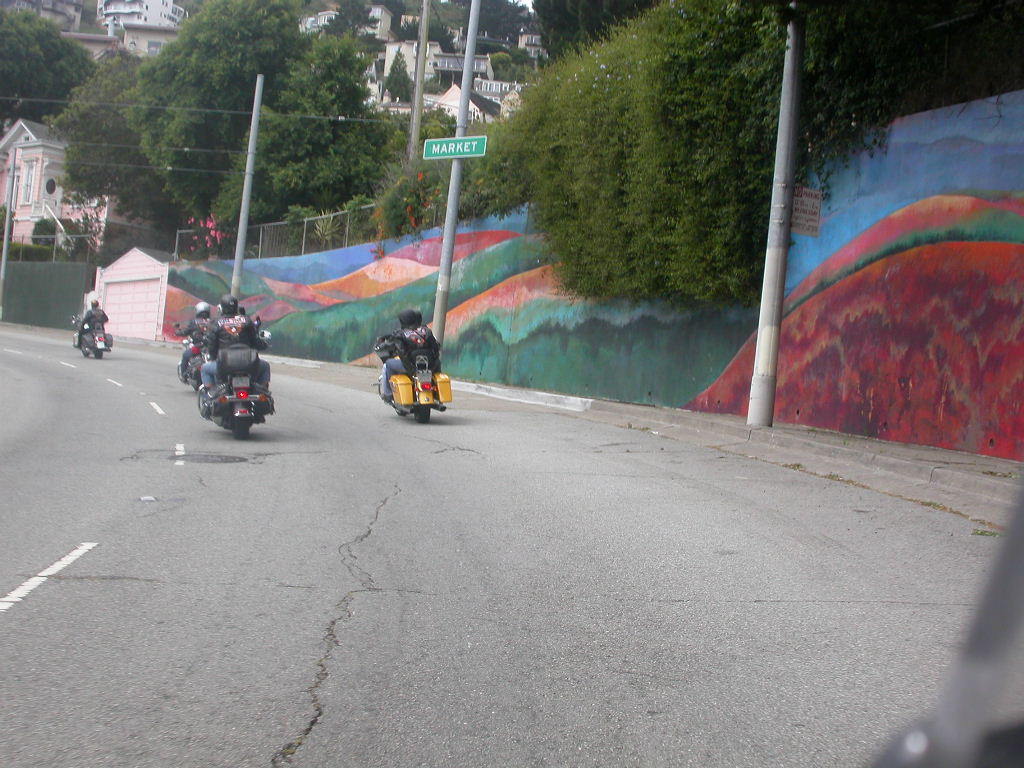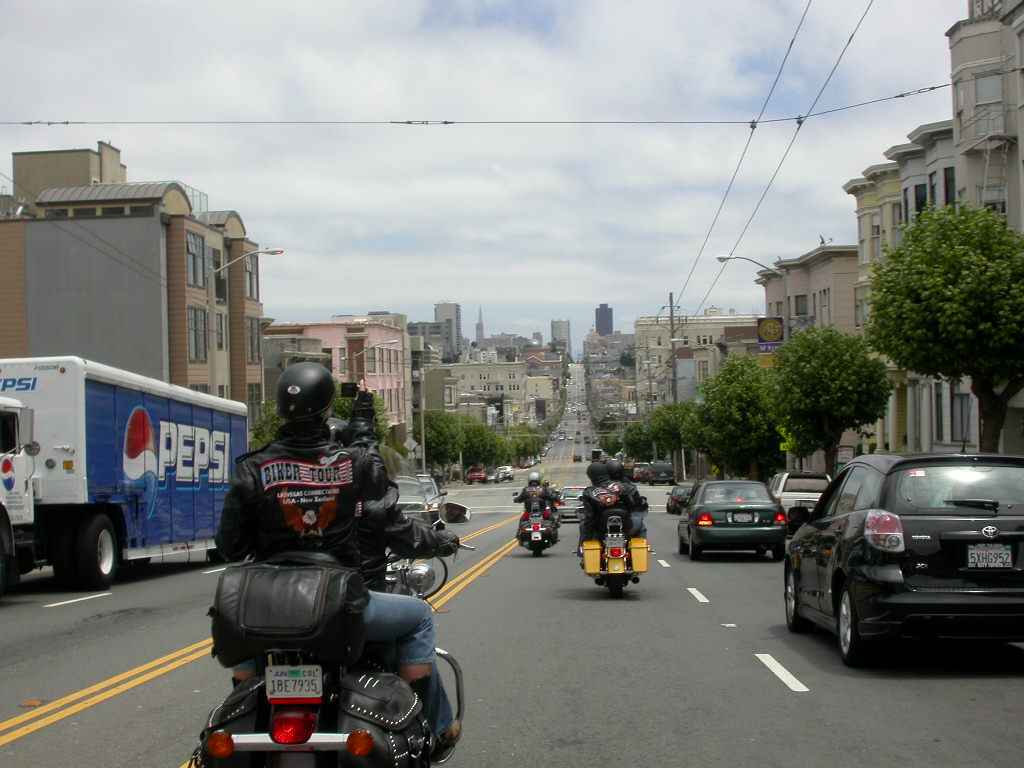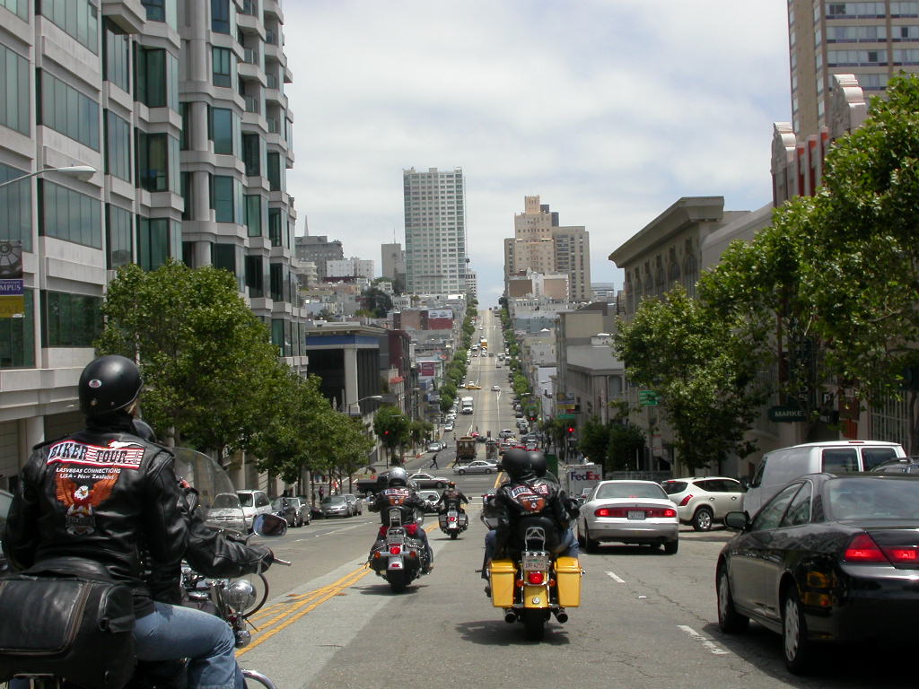 Für das Sight-Seeing in San Francisco stand erstmal 45 Minuten Autobahnfahrt über die Bay und dann in die Stadt hinein auf dem Programm. Es ist schon was ganz anderes hier im dichten Verkehr auf bis zu 6 Spuren, wo links und rechts Überholen erlaubt ist, im Konvoi zu fahren als auf den verlassenen einsamen Strassen der letzten Tage.