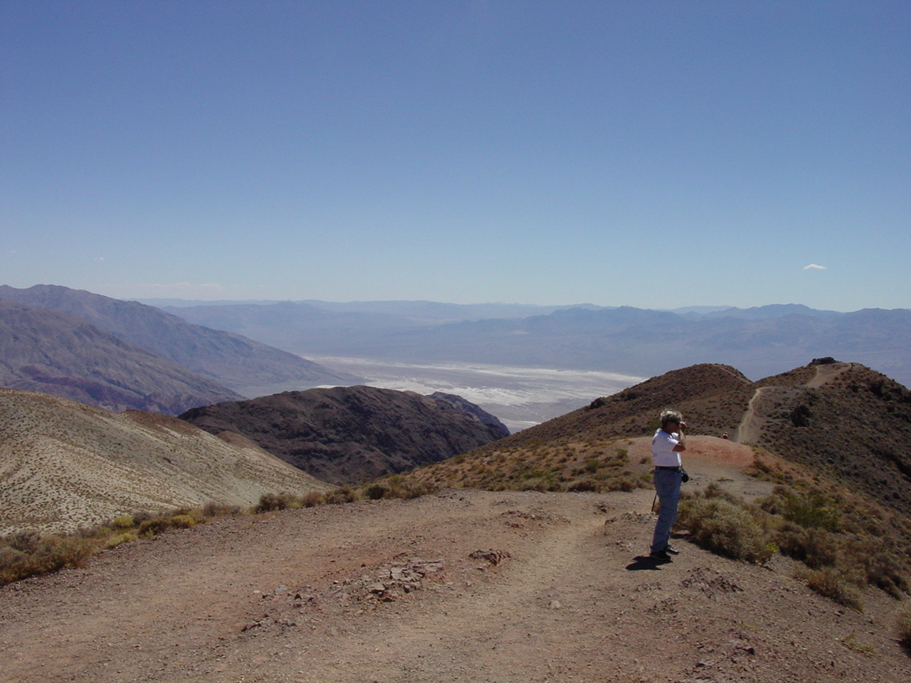 Die Lichterwüste Las Vegas verliessen wir durch den Red Rock Canyon um in die richtige Wüste, in das Tal des Todes zu gelangen. Versorgt mit reichlich Mineralwasser fuhren wir zum ersten Aussichtpunkt 'Dantes View' auf 1669 MüM. Von hier oben hat man eine imposanten Überblick über das Death Valley und hinunter in die flimmernde Hitze. Auf dieser Höhe war es noch angenehm Frisch, doch mit jedem Meter, den wir weiter in das Tal hinunterfuhren wurde es heisser.