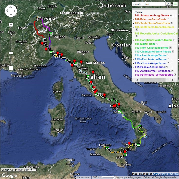 Die Tour führt uns zuerst nach Genua, wo wir auf die Fähre nach Sizilien einschiffen. Sizilien durchqueren wir von Palermo nach Mesina entlang der südlichen Flanken des Ätnas. Weiter geht es durch den Fuss des Stiefels zur Amalfiküste. Die Reise führt uns über Rom weiter durch die Toskana und Ligurien ins Piemont und zurück in die Schweiz.
