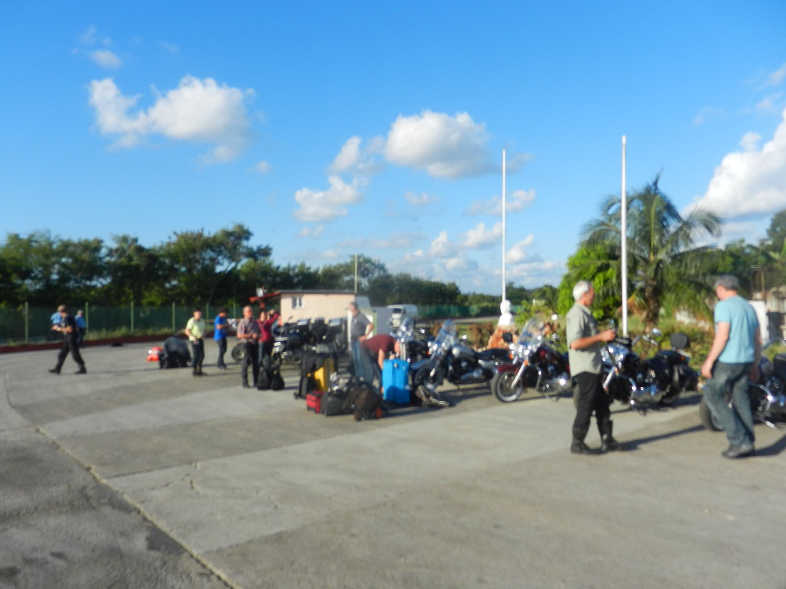 Nachdem wir alle Formalitäten und Probefahrten erledigt hatten, starteten wir im Konvoi von 19 Bikes zu unserer Rundreise. Zuerst führte uns Hanival (aka Hannibal), der Tourguide vom Vermieter, durch die Vororte auf den Malecón zurück. Vorbei an der CH-, US-Botschaft und unserem Hotel näherten wir uns der Altstadt. Für einmal waren nicht die farbigen Oldtimer die Attraktion in der Altstadt, sondern unsere dröhnenden Maschinen. Überall standen die Leute, winkten und fotografierten.