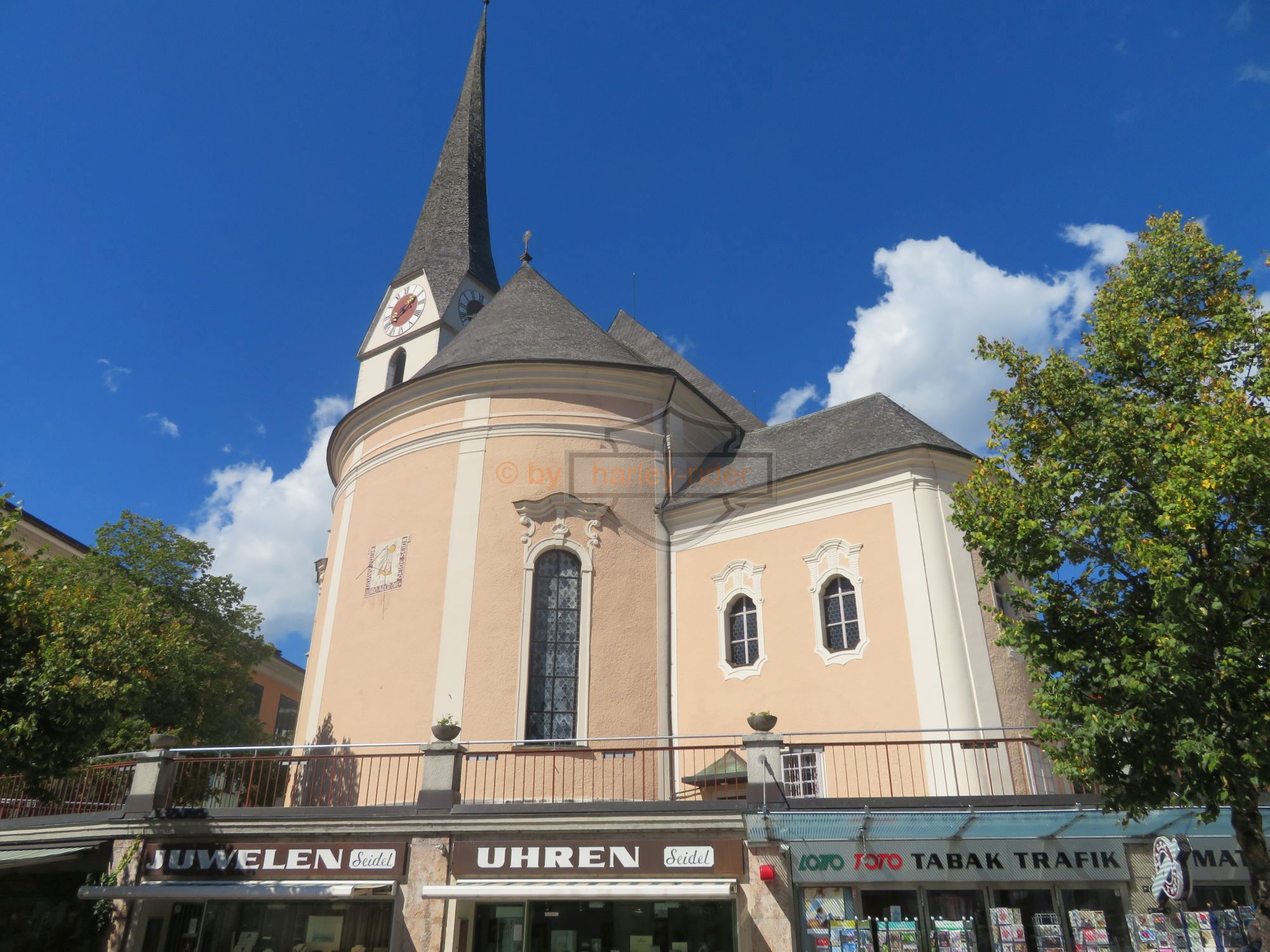 Die erste Tour hätte uns eigentlich zum Attersee, St. Gilgen und über den Pechauer Sattel nach Salzburg führen sollen. Doch der Regen in den 'Voralpen' zwang uns zu einer nördlichen Route auf der Bundesstrasse über Vöklabruck nach Salzburg. Dort fuhren wir zum Harleyhändler wo wir wieder auf den Rest der Gruppe stiessen. Die waren schon früher gefahren, denn Haris Maschine benötigte den ersten Service.