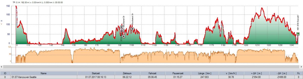 Zu Beginn fahren wir, abseits der stark befahrenen Highways, dem Fraser Fluss entlang und überqueren die Grenze zur USA bei Sumas. Auf dem Highway #9 geht es südwärts bis Burlington. Da biegen wir westwärts zu den vorgelagerten Inseln 'Fidalgo Island' und 'Whidbay Island' ab. Die Fähre 'Clinton - Mukilteo' bringt uns im Verlauf des Nachmittags auf das Festland zurück. Schon bald erreichen wir Seattle und unser Abenteuer 'Rocky - Mountain' geht dem Ende entgegen.