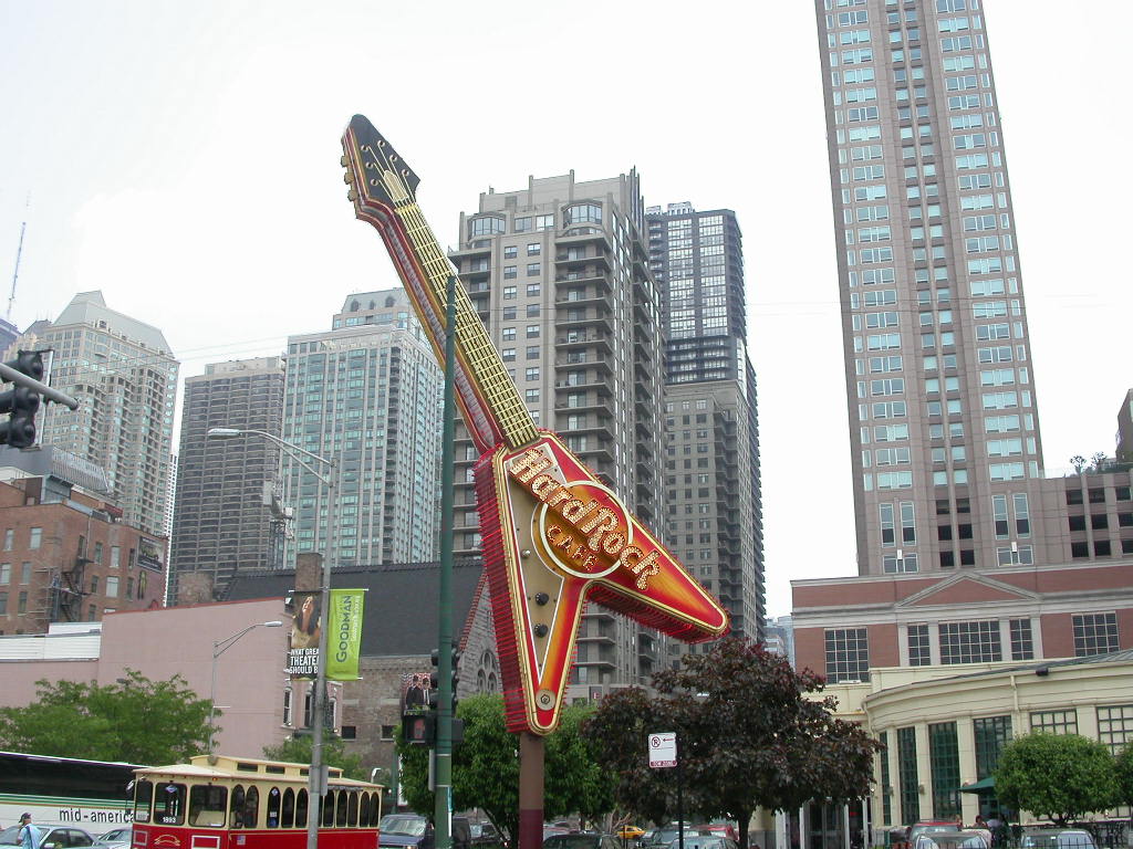 Nach diesen obligaten Fotos ging der Spaziergang weiter über den Chicago River zum Harley Dealer von Chicago. Da ich bereits ein T-Shirt von ihm in meiner Sammlung habe konnte ich hier etwas Geld sparen. Anschliessend gab es einen Chickensalat im Hard-Rock-Cafe. Schon bald musste ich dann zurück an den Flughafen fahren, um die Reiseteilnehmer in Empfang zu nehmen. Diese trafen mit zum Teil erheblicher Verspätung und leider einer auch ohne Koffer in O'Hare ein. Der Koffer wurde nach Ft. Meyers geschickt und wir dürfen ihn dann morgen hoffentlich in Empfang nehmen.