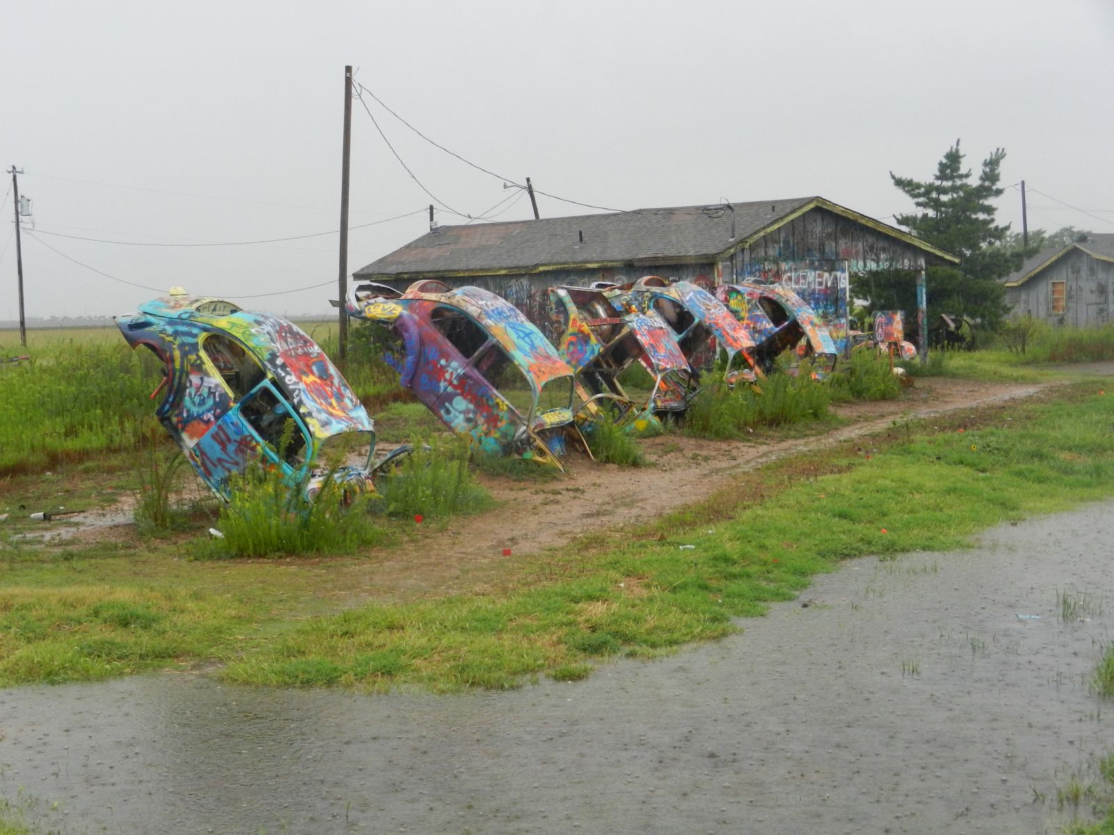 Kurz vor Groom verpasste Klaus eine Überquerung auf die nördliche Seite der Interstate so dass wir den schiefen Turm von Groom nur von weitem sahen. Dafür hielten wir dann beim 'Giant Cross', einem 58 Meter hohen Kreuz, das wegen seiner Lage und Größe weithin sichtbar ist, an. Die Basis des 1995 von Steve Thomas errichteten Kreuzes ist mit lebensgroßen Kreuzwegstationen ausgestaltet. Hier begann es wieder zu regnen und entsprechende Kleidung war angesagt.