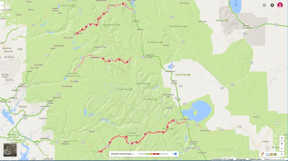In der Sierra Nevada gab den Winter hindurch sehr viele Niederschläge wie seit Jahren nicht mehr. Was für die Region gut ist, ist für mich schlecht, denn der Tjoga-, Sonora- und Ebbettspass haben noch Wintersperre und ich kann sie nicht wie geplant befahren.